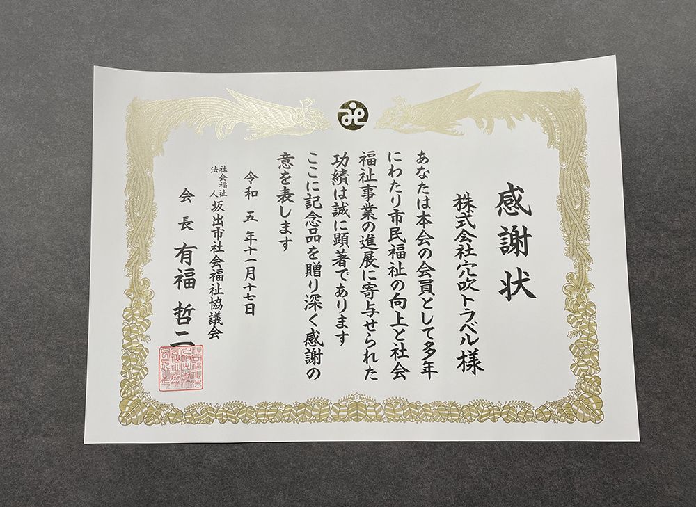 2023年11月17日、あなぶきトラベルが社会福祉法人坂出市社会福祉協議会より、会員功労団体として表彰を受けました。 坂出市社会福祉協議会が実施する視察・研修旅行に、当社が20年以上従事。 市民福祉の向上と社会福祉事業の進展に長きにわたり貢献した事業者として、高い評価を得ました。 今後も更なる成長と発展を目指し、日々精進を重ねて参ります。