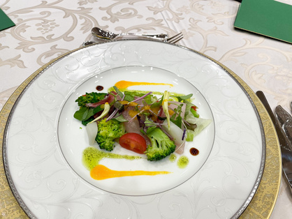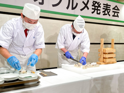 今回の発表会では、高松国際ホテルの松原総料理長、岡本和食料理長の協力を得て考案された、「せとうち讃岐ジオグルメ」のコースメニューがお披露目されました。